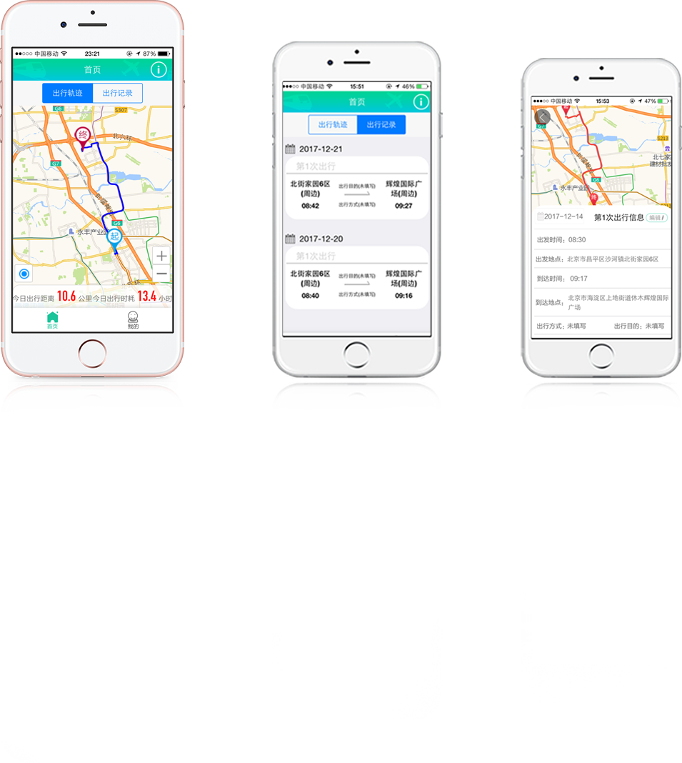APP實時采集當前位置(支持GPS、基站、WiFi定位),出行軌跡顯示在主界面,采集的軌跡實時上傳的服務器,且系統進入后臺仍可實時采集位置信息;